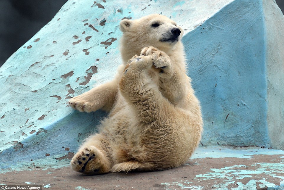 The four-month-old polar bear was photographed stretching while relaxing at her enclosure in Novosibirsk Zoo[CN]