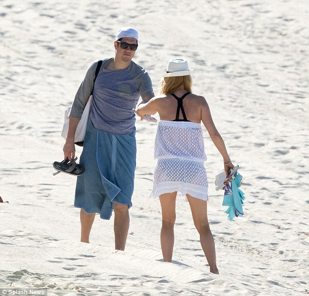Vernon, 41, opted for a long sleeved grey T-shirt, seemingly immune to the sunny climes, whilst he wrapped a teal beach towel around his waist.