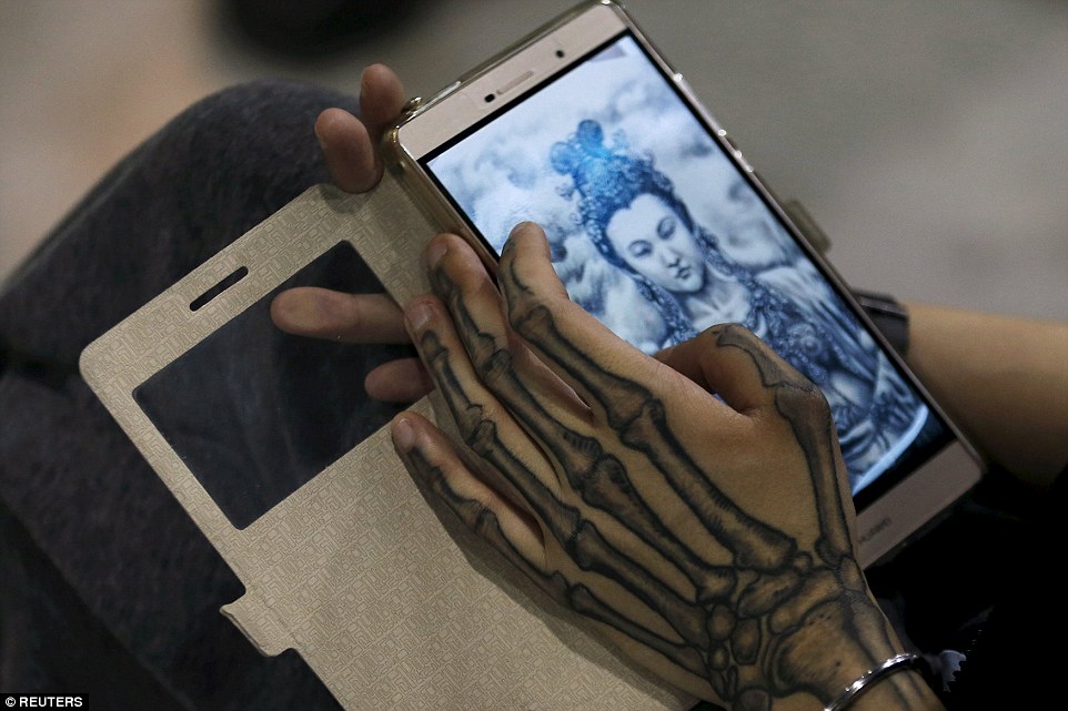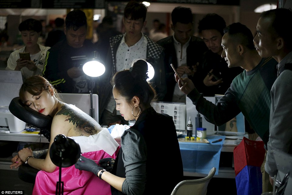 Posing: Plenty of admirers seized the chance to snap photos of their favourite designs and pick up inspiration for their next inking[CN]