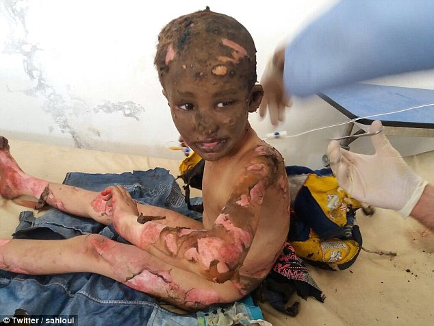 A severely burned young boy is treated at the Syrian-American Medical Society hospital after 'napalm bombs' were reportedly dropped in an airstrike in Syria's Hama province