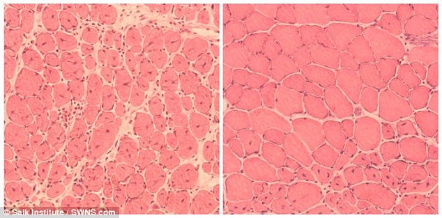 The final test involved trying the method on normal aged mice. When it was used for a short period, the pancreas and muscles showed improved regeneration. Pictured left are muscle cells before the technique was usedfactors were induced, and right, after[CN]
