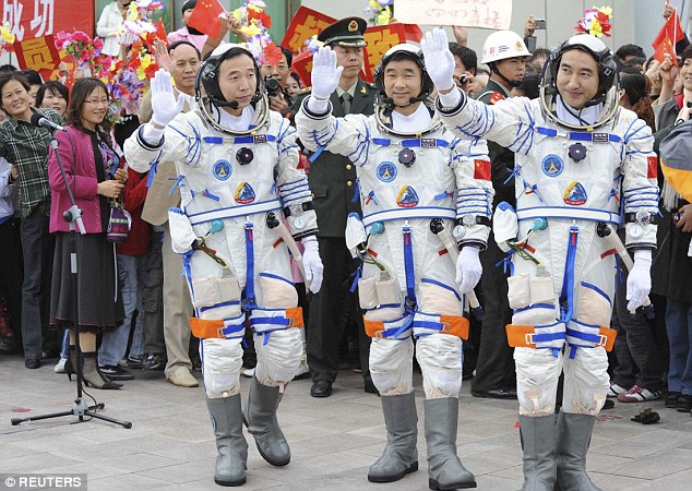 2008年9月25日,甘肃省酒泉卫星发射中心,神州7号载人飞船发射前夕,中国宇航员翟志刚,刘伯明和景海鹏向前来祝福的人群挥手致意。