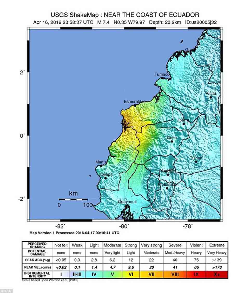 A shakemap shows the location of a 7.4 magnitude earthquake near Esmeraldas, some 28km South-southeast of Muisne, near the coast of Ecuador