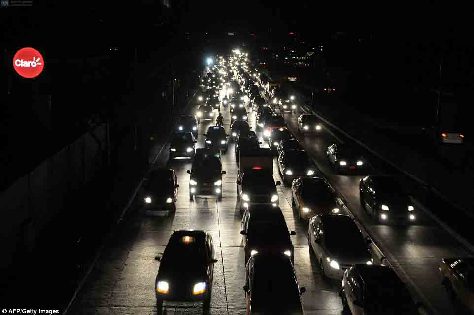 Cars travel on a darkened street using only their headlights to guide the way after the failure of electrical service in Guayaquil